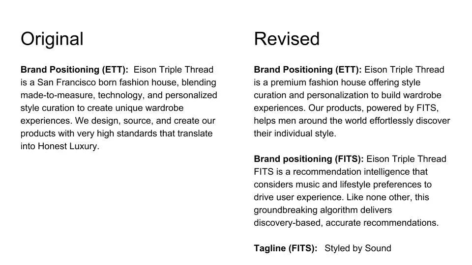How does music impact your everyday clothing decisions? Eison Triple Thread passionately sought an answer to that very question. Their solution: a platform that’s never existed, FITS. Once connected to Spotify, FITS presents clothing recommendations aligned to your lifestyle and music preferences. As compelling as the technology was, they struggled to translate this innovative concept into words their customers understood. I was asked to think through their how the tech impacts their brand positioning, and below are the results.
